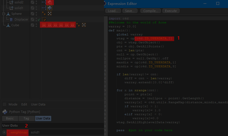 注意:直接將要控制的點權重拉到你要控制的物體上,有時會發(fā)現(xiàn)Python標簽失效,雙擊打開,將1中的字段刪除,將2拉到1的位置上重新生成下就可以了