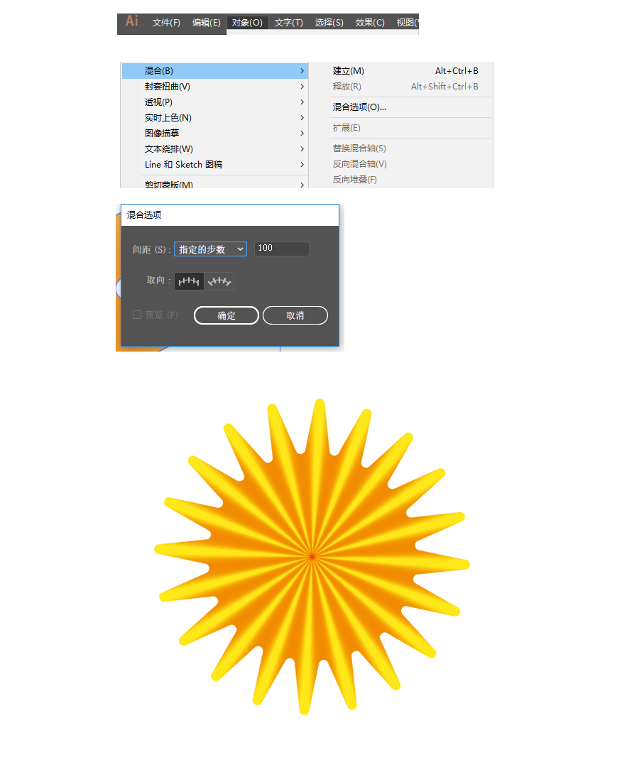 7. 全選2個(gè)大小太陽(yáng)用混合模式來(lái)做效果,菜單中點(diǎn)擊 對(duì)象 —> 混合 —> 混合選項(xiàng) ,填寫(xiě)數(shù)值后,重新點(diǎn)擊 對(duì)象 —> 混合 —> 建立