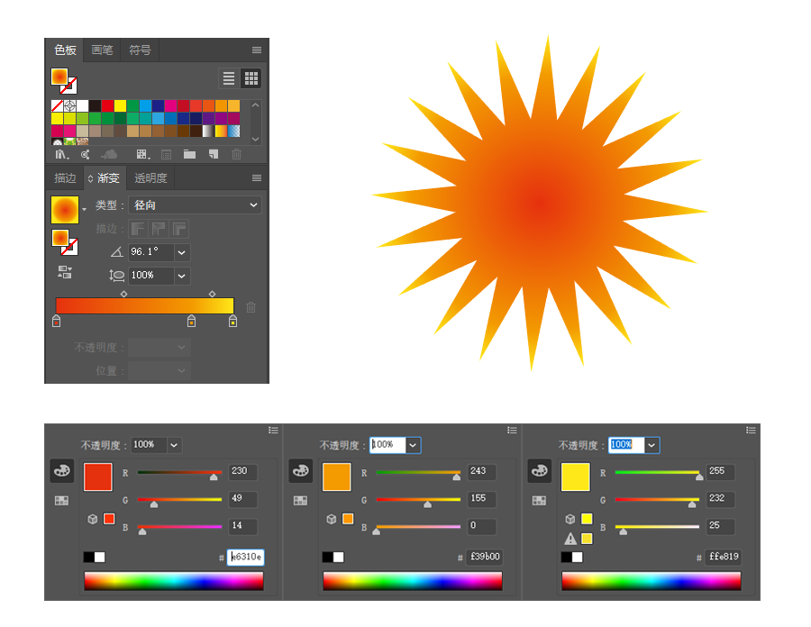 4. 接著需要把形狀上色,先用徑向漸變色做模版,我們就再邊上新做個(gè)圓型的漸變,調(diào)試后吸取即可。