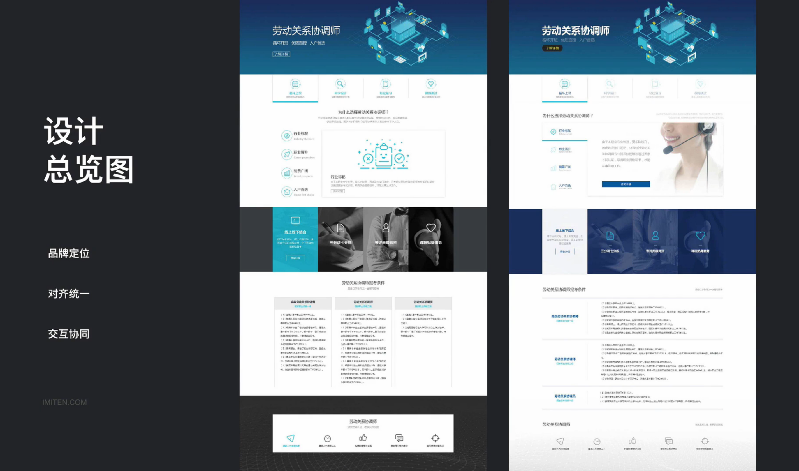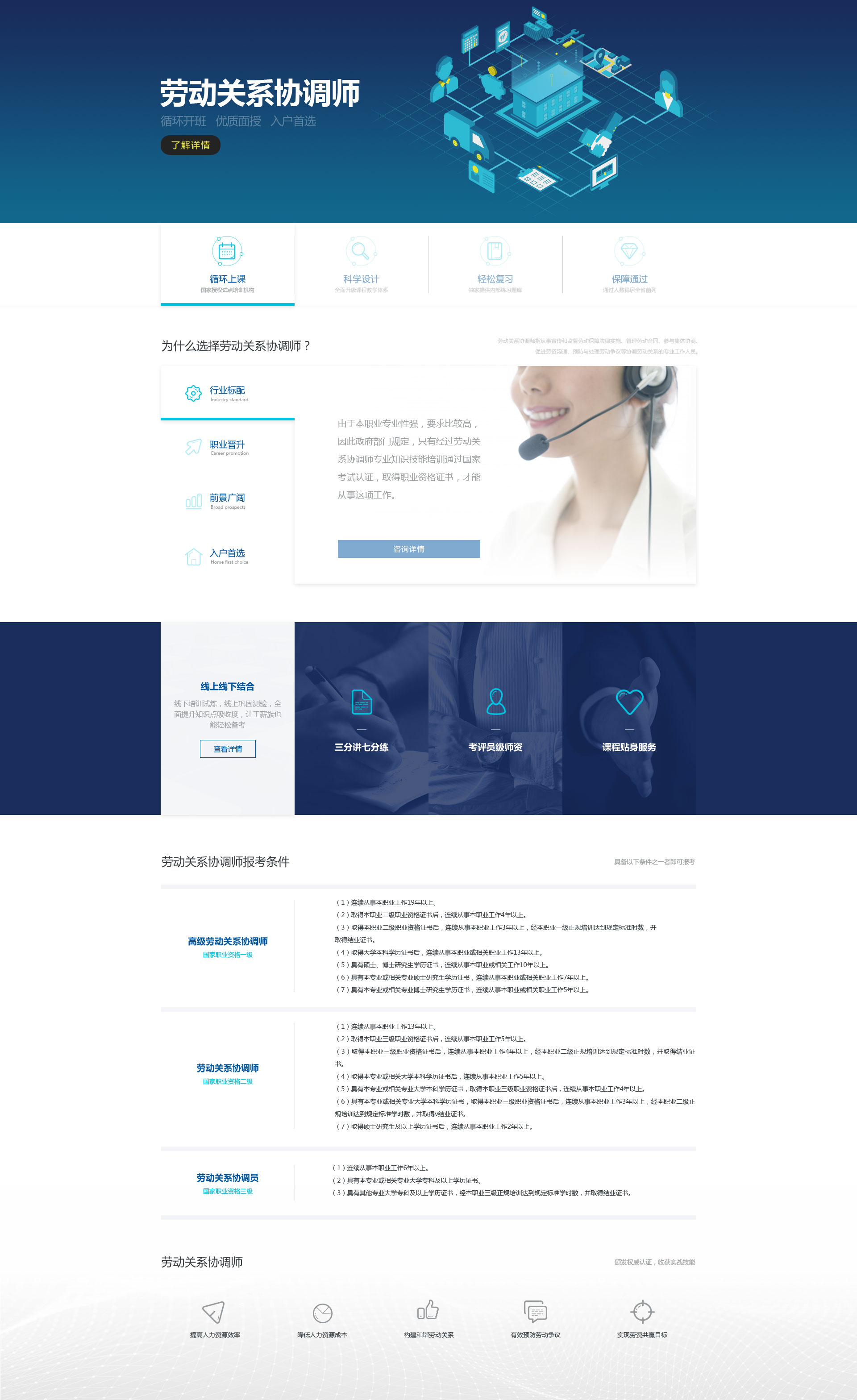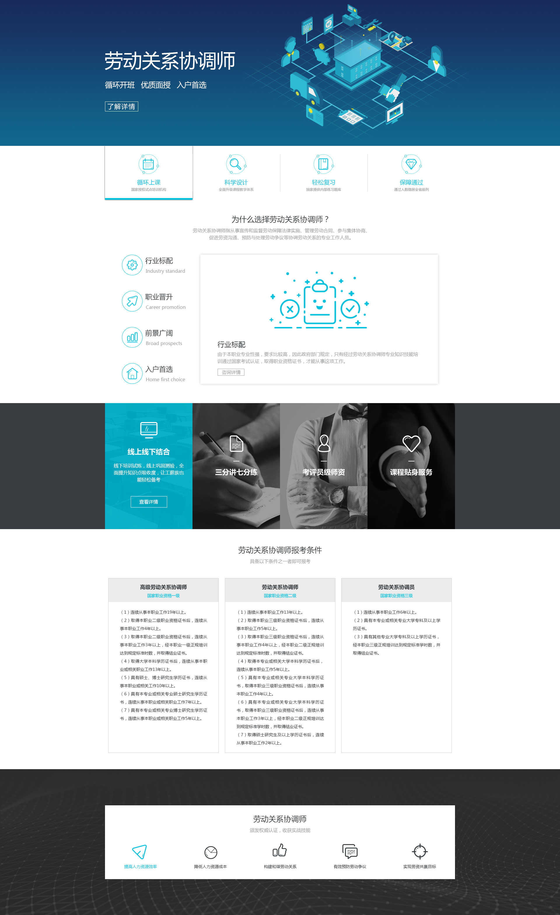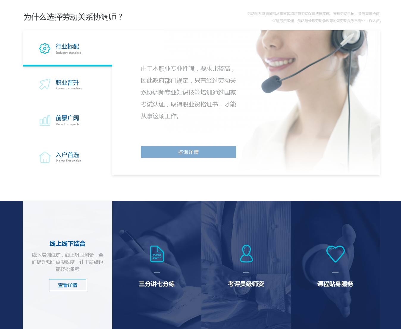 這是一個(gè)勞動(dòng)關(guān)系協(xié)調(diào)師的招生宣傳網(wǎng)頁(yè),偏內(nèi)容視覺展示,老板想要藍(lán)色商務(wù)風(fēng)格,上線后發(fā)現(xiàn)頁(yè)面好像平淡了些,不能讓人眼前一亮。
