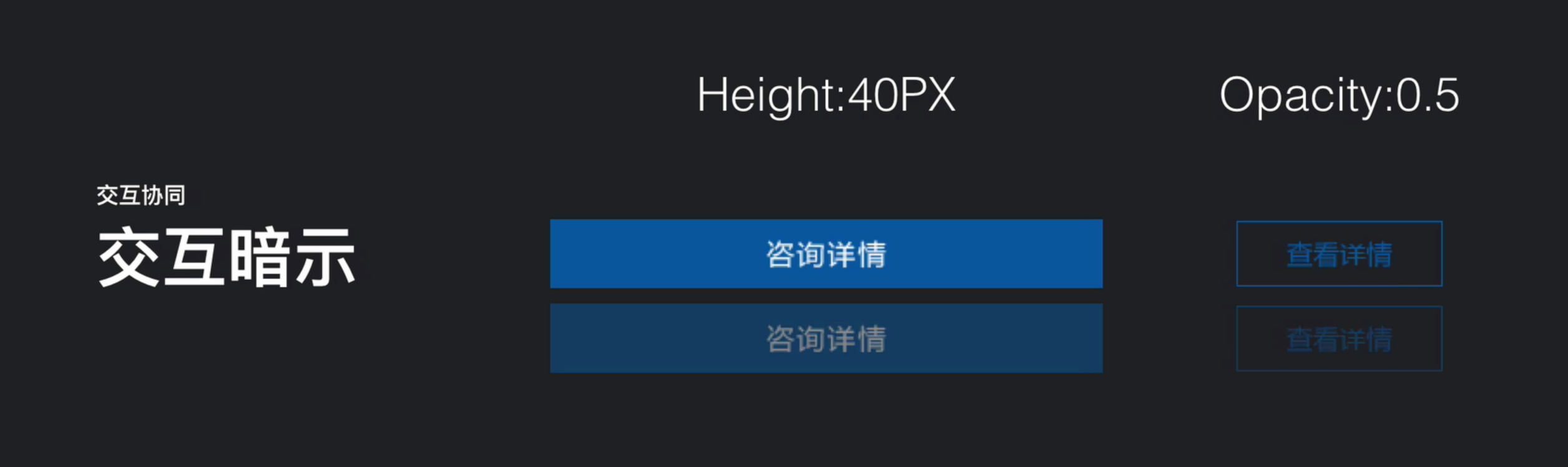 理論上所有可點(diǎn)擊的設(shè)計(jì)都算得上交互協(xié)同的一部分,交互協(xié)同需要給予用戶交互暗示,強(qiáng)調(diào)交互區(qū)域,告知用戶此處可以點(diǎn)擊。例如可以使用藍(lán)色高亮的實(shí)心按鈕,或者藍(lán)色線性空心按鈕表示,鼠標(biāo)移上去時(shí)透明度可以弱化成50%,形成交互反饋,同時(shí)方便前端頁(yè)面切圖。