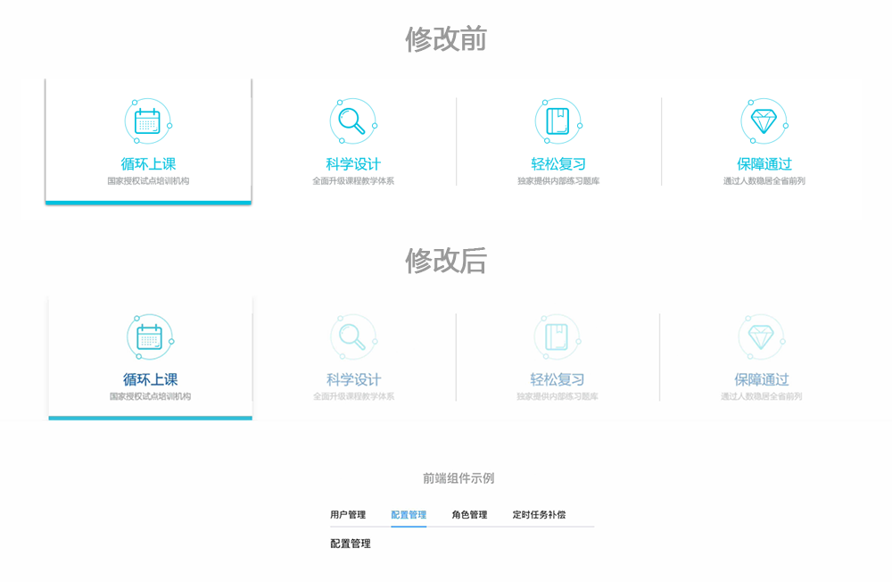 原設(shè)計(jì)稿中亮青色應(yīng)用過(guò)多,容易使人產(chǎn)生視覺疲勞。同時(shí),前端組件中的Tabs標(biāo)簽頁(yè)規(guī)定,不同的交互狀態(tài)也需要呈現(xiàn)出不同的視覺效果,所以可以利用透明度的變化產(chǎn)生設(shè)計(jì)的層次感,如圖所示,選中狀態(tài)下透明度100%,非選中狀態(tài)下透明度50%。