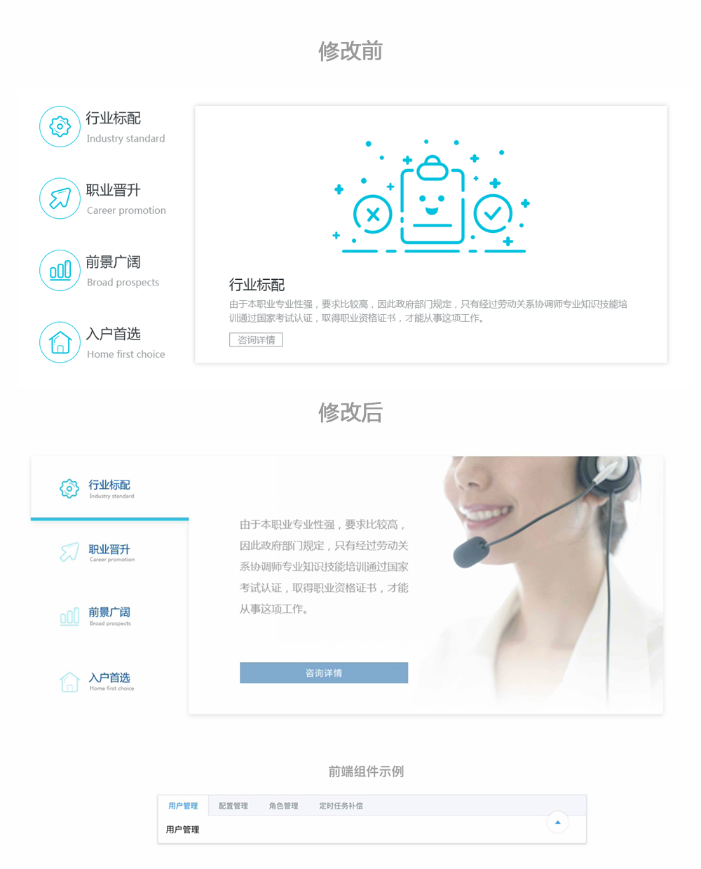 原設(shè)計(jì)稿中行業(yè)標(biāo)配的插畫配圖不太恰當(dāng),可以考慮跟下面模塊的設(shè)計(jì)風(fēng)格呼應(yīng)。如果頁(yè)面中采用實(shí)景圖片素材,可以選擇在不同位置穿插,而不是只有一個(gè)部分在用。