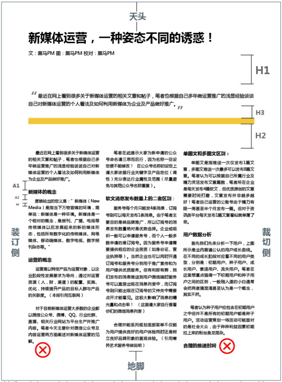 與此類似的規(guī)則還有標(biāo)題不落底。(見上圖畫叉出),標(biāo)題作為一段的統(tǒng)領(lǐng)和總結(jié)是需要整段文字為其說明服務(wù)的;所以標(biāo)題在排到一頁或一欄的最后是不能與該段落文字首身分離的,這個(gè)細(xì)節(jié)大家平時(shí)一定要注意!如果出現(xiàn)此類情況,需要調(diào)整上一段的文字行距將標(biāo)題強(qiáng)制擠到下一頁或下一欄。