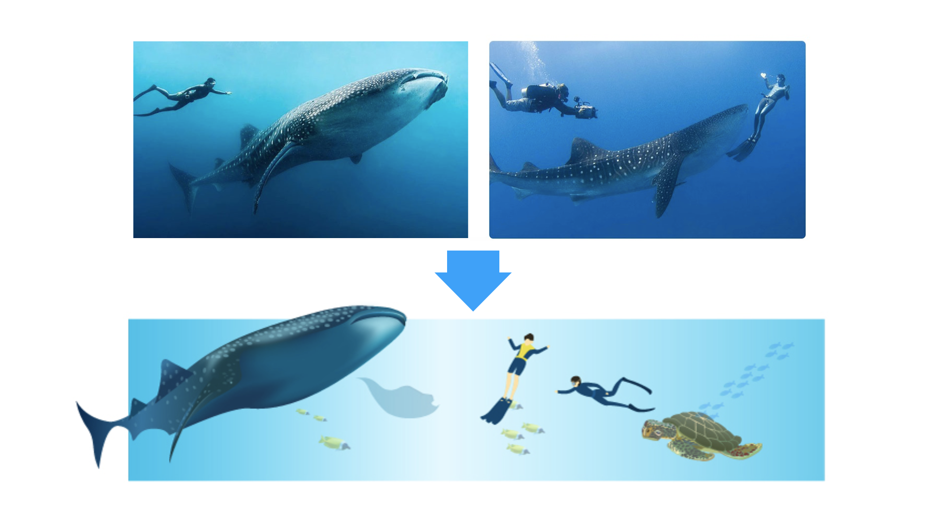 這里要注意的是不用畫得特別詳盡,因?yàn)榍懊孢€有一層海水的遮擋,細(xì)節(jié)可以適當(dāng)省略。海洋生物的放置利用不同透明度,細(xì)節(jié)差異,來營造透視感。不避諱地說,海龜使用了隨處可見的素材,細(xì)節(jié)簡化以后使用。