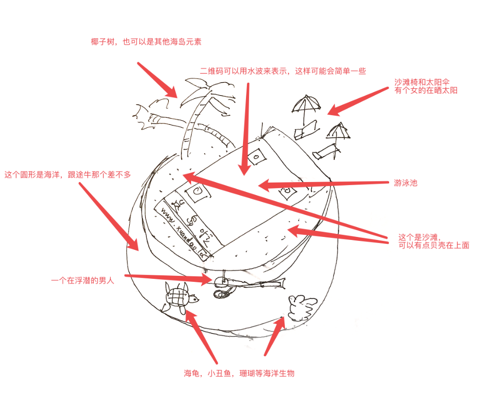 過不久,選島啦發(fā)來一個(gè)自己想法的草圖。注意,這個(gè)草圖意見已經(jīng)表達(dá)得很棒了,對方畢竟是設(shè)計(jì)同行。很多有自己意見,想自己設(shè)計(jì)方案的客戶并不能這么完整規(guī)劃,只會告訴你關(guān)鍵詞匯信息,或者就“我要高大上”這樣的要求。