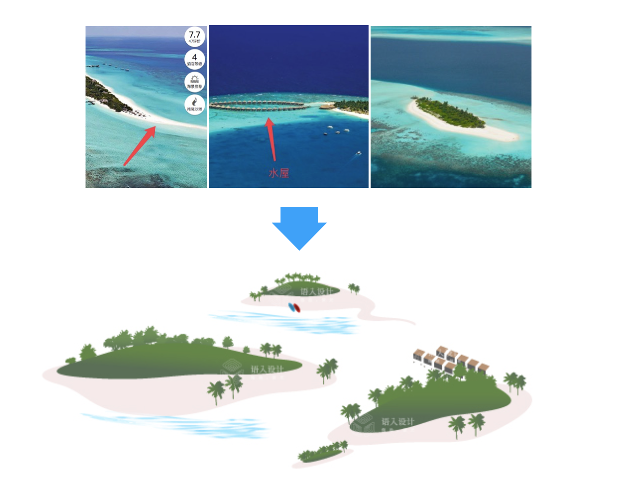 提煉的信息有馬代特色旅游項(xiàng)目以及延伸。至于為什么是三個(gè)島嶼:兩個(gè)太少;三個(gè)以上構(gòu)圖出來島上信息表達(dá)出來太小看不清。同時(shí)也擔(dān)心成品文件太大(圖片小加載快好使用)。