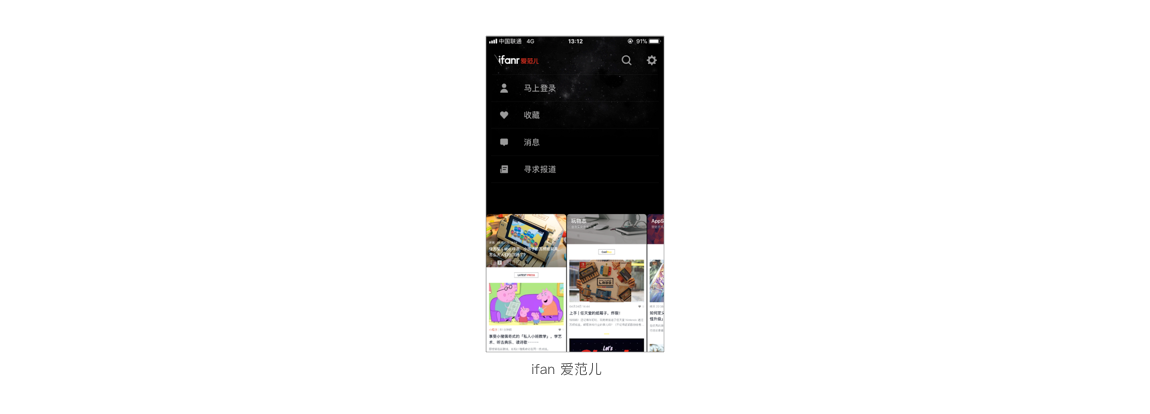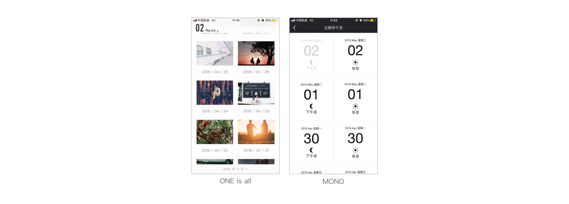 上圖的全屏卡片為應(yīng)用 ONE is all 和MONO上的選擇菜單欄設(shè)計(jì)