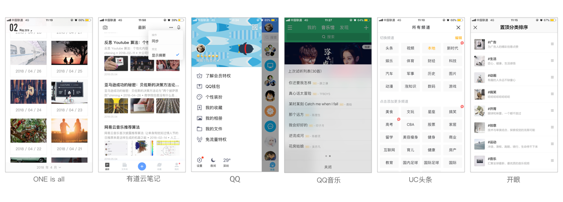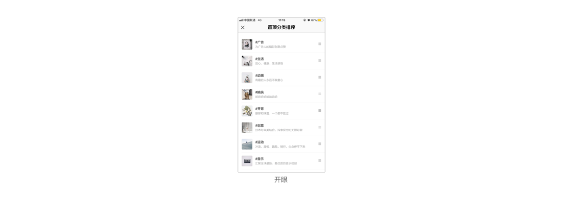 以上是開眼APP的置頂菜單選項(xiàng)頁面,列表展示方式,右邊可移動(dòng)操作