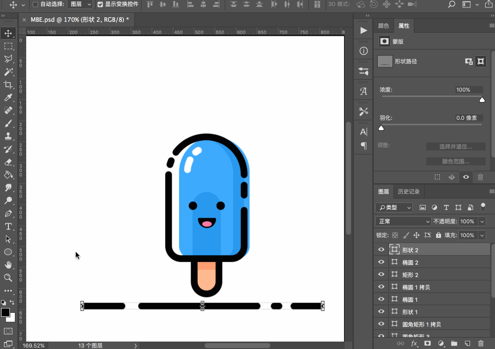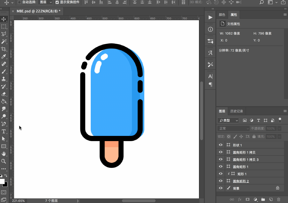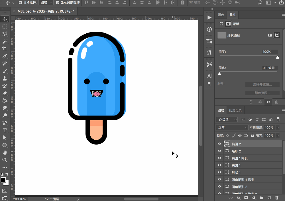 為嘴巴部分添加描邊,將角點改為圓角,并繪制舌頭部分,至此雪糕主體部分就都畫完了。