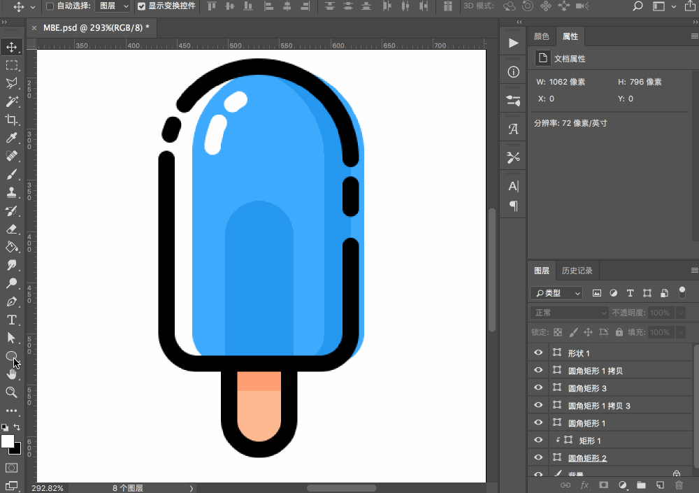 用圓角矩形繪制雪糕棒部分,用剪貼蒙板的方法形成陰影。