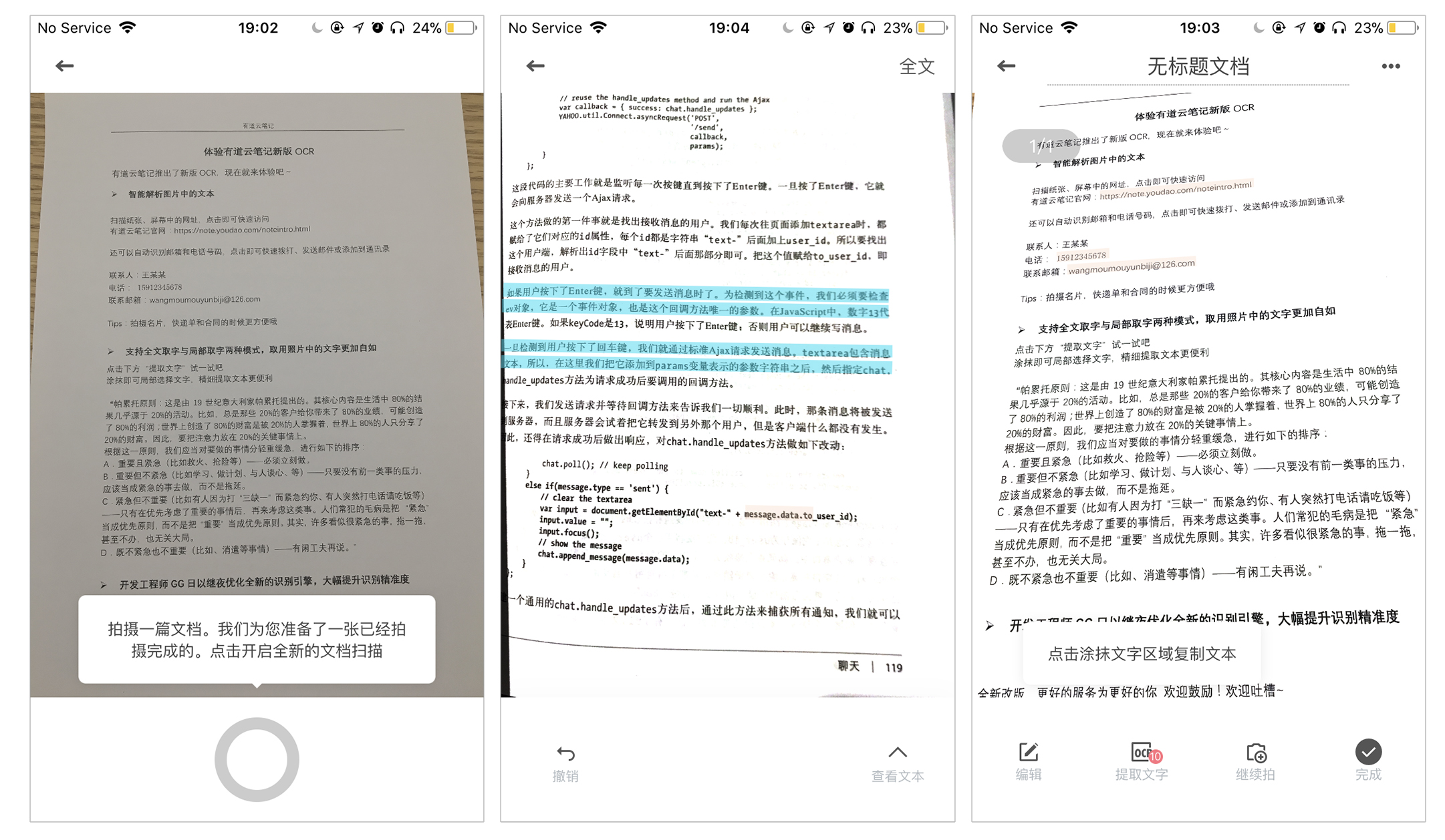 在記錄工具如有道云筆記,可以通過掃描快速將紙質(zhì)文檔轉(zhuǎn)化成可編輯的文字,如下圖所示: