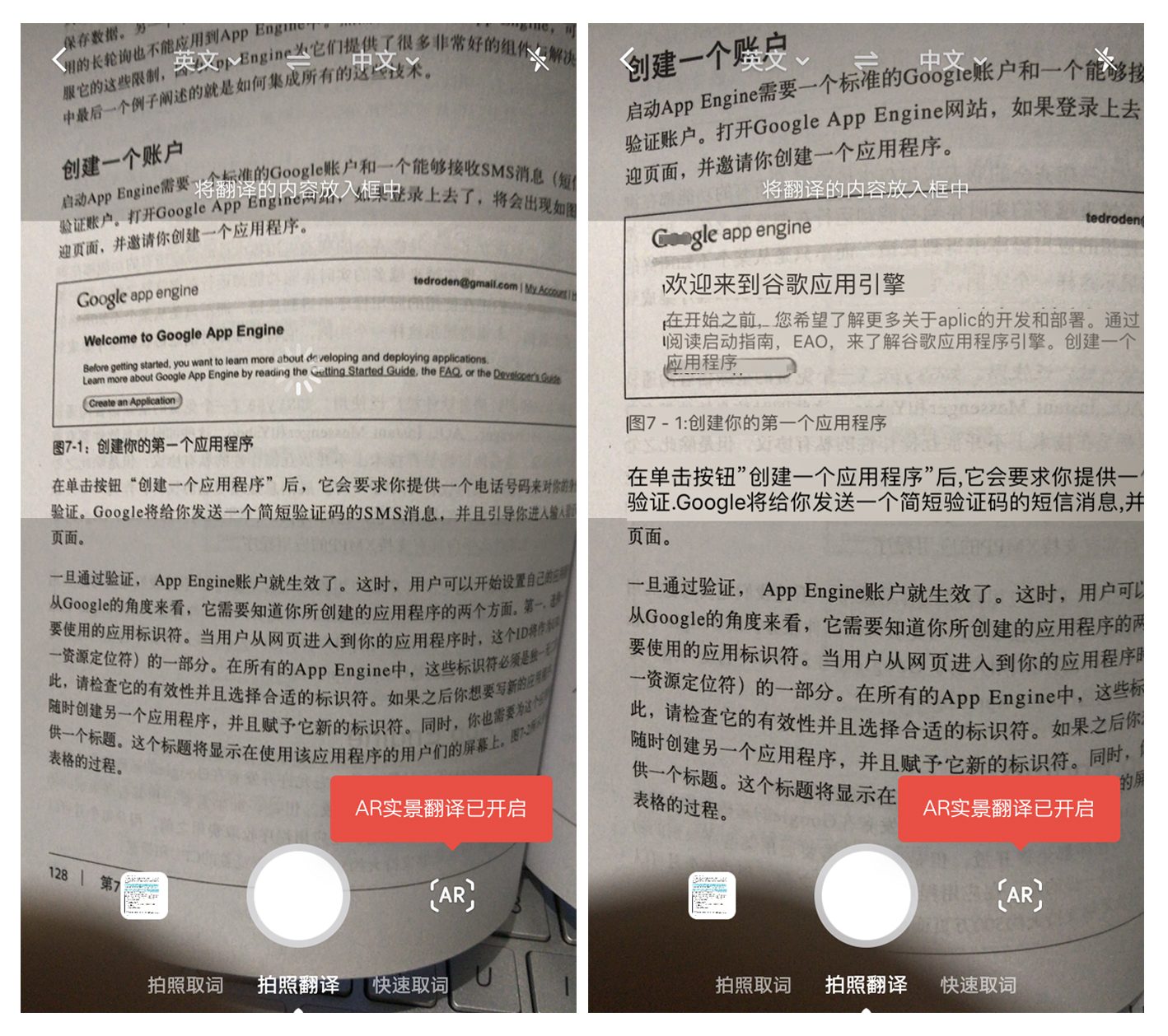 ? 實景輸入常見的有英文詞典工具實景翻譯,如下圖所示。掃描后出現(xiàn)譯文,直接了當?shù)臑橛脩暨M行翻譯。