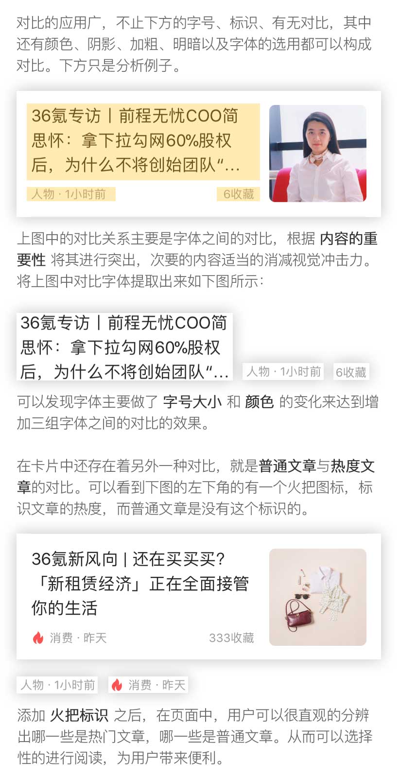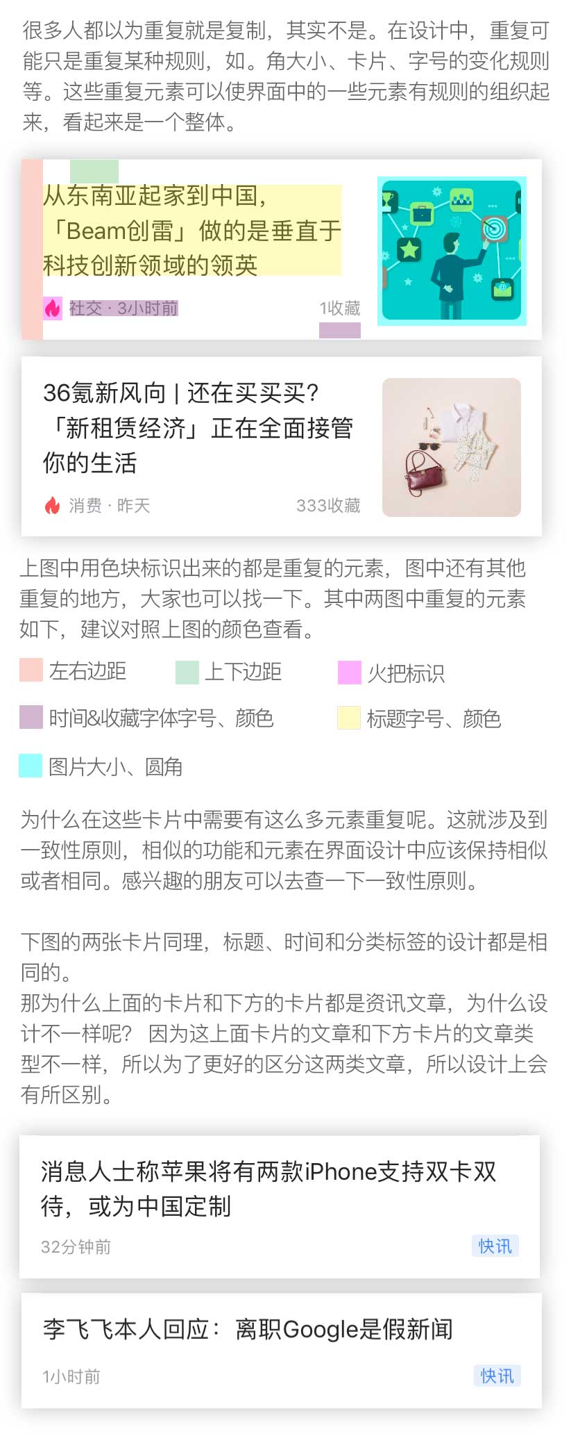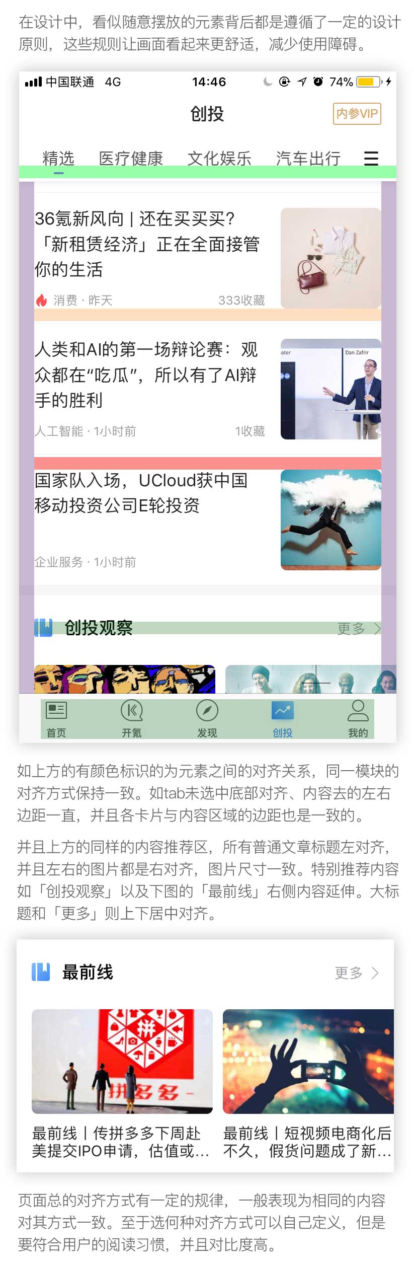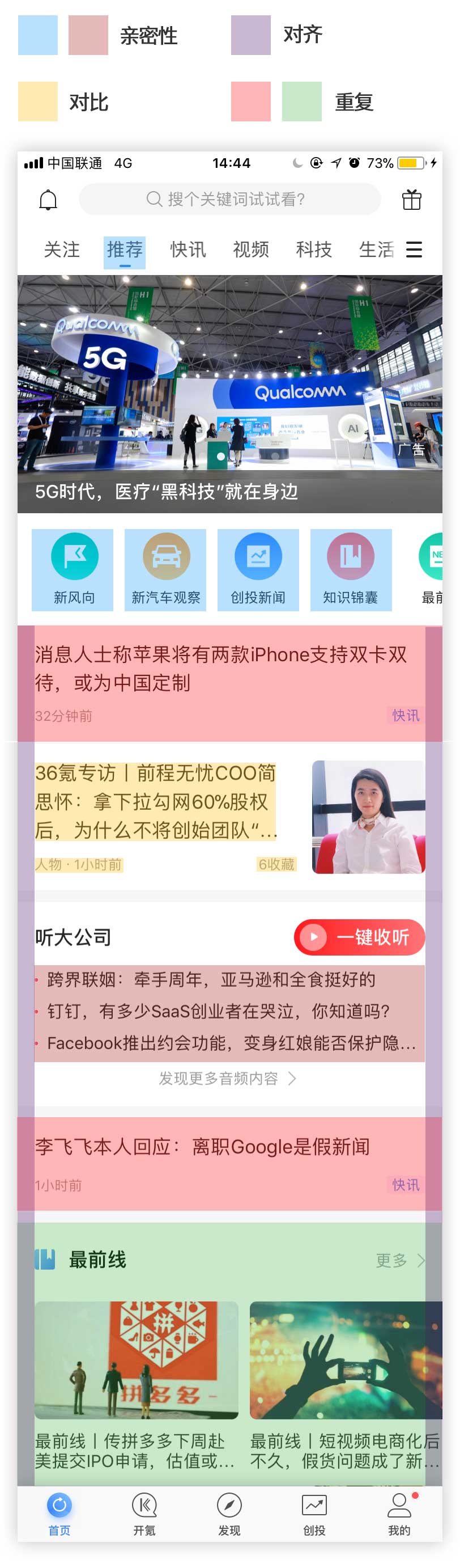 以36krAPP界面為例講解四大原則的應(yīng)用,首先展示36kr的頁(yè)面,有色塊標(biāo)識(shí)的,則為后文重點(diǎn)講解的部分。