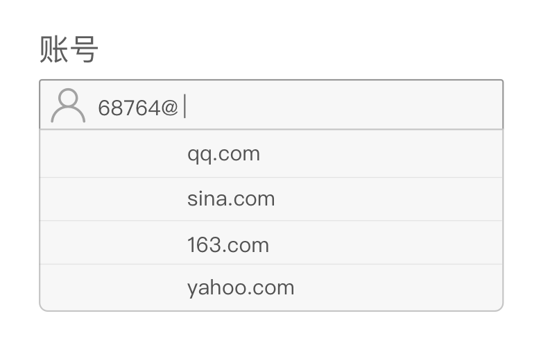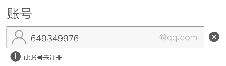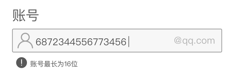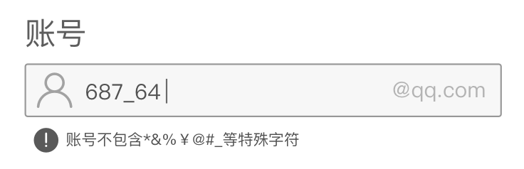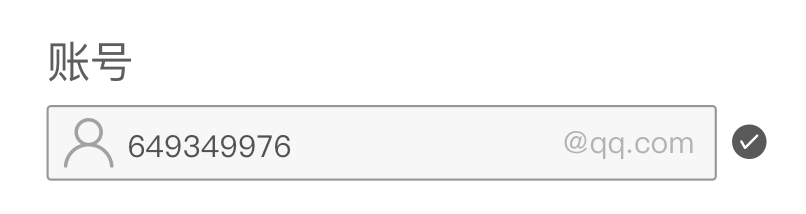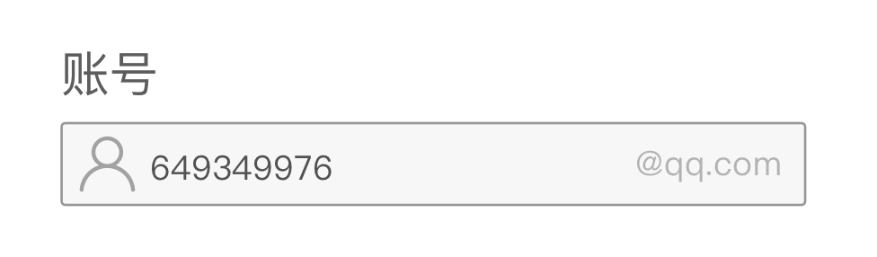 通常在一些應(yīng)用/網(wǎng)站中,會(huì)指定一些特殊的賬號(hào)輸入(后臺(tái)較多),例如某種特定格式的前綴或者是后綴,如KK開頭的工號(hào),或者是某種郵箱賬號(hào)后綴。這時(shí)候?yàn)榱朔乐褂脩糨斿e(cuò),會(huì)在輸入框預(yù)置前綴或者是后綴,用戶只需要輸入可變部分即可,簡化了操作,降低錯(cuò)誤率。如下圖所示給出固定的后綴@qq.com。