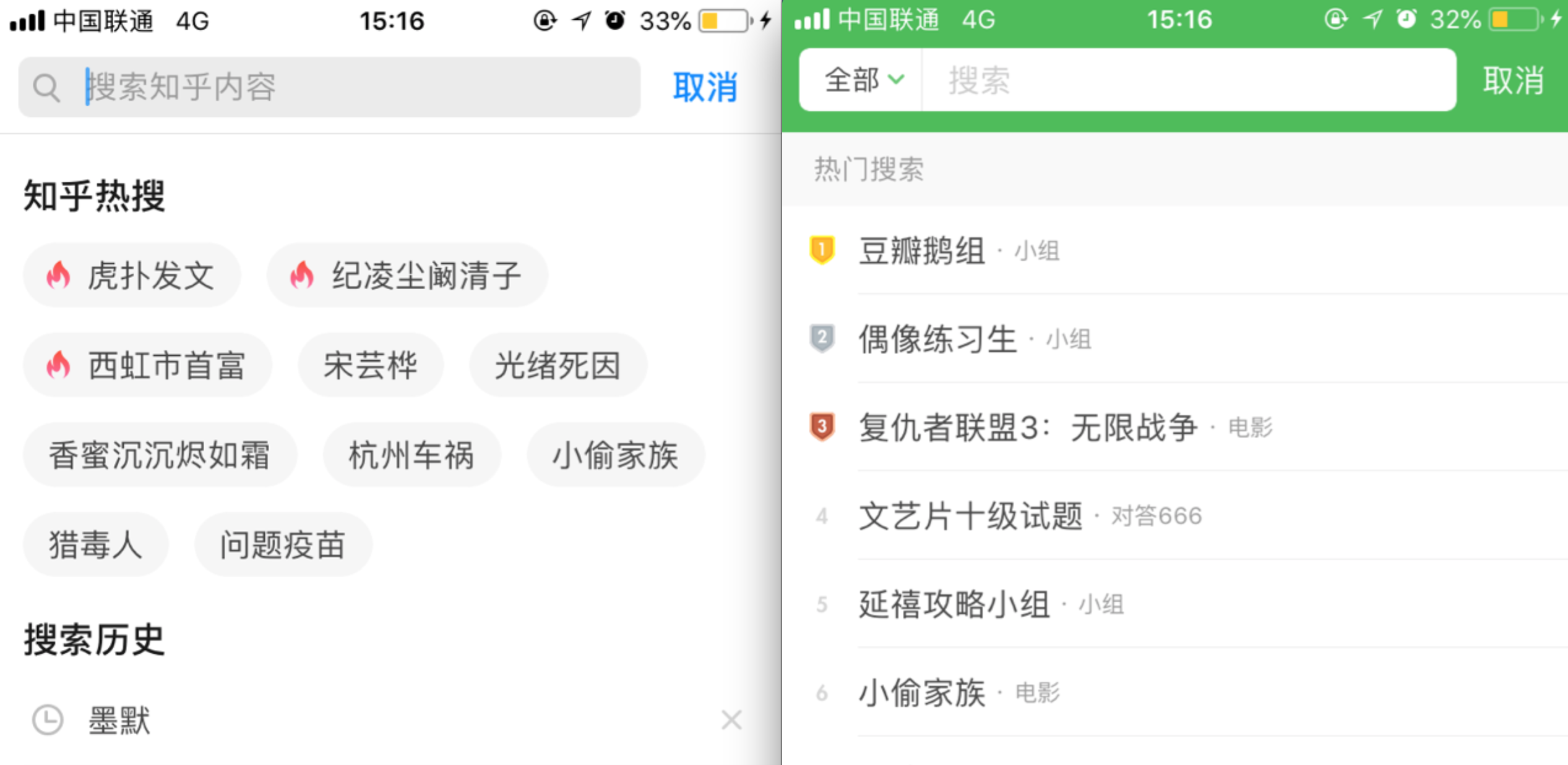 在一些搜索框中,經(jīng)常用到選擇輸入,例如一些推薦的搜索,推薦的標(biāo)簽、歷史記錄等,用戶點(diǎn)擊一下即可輸入,大大減少了用戶的操作步驟。這種方式現(xiàn)有的應(yīng)用中也應(yīng)用得非常廣泛,最常用于搜索頁面。如下圖的知乎的搜索框和豆瓣的搜索頁面,推薦一些熱門話題,點(diǎn)擊即可進(jìn)行搜索。