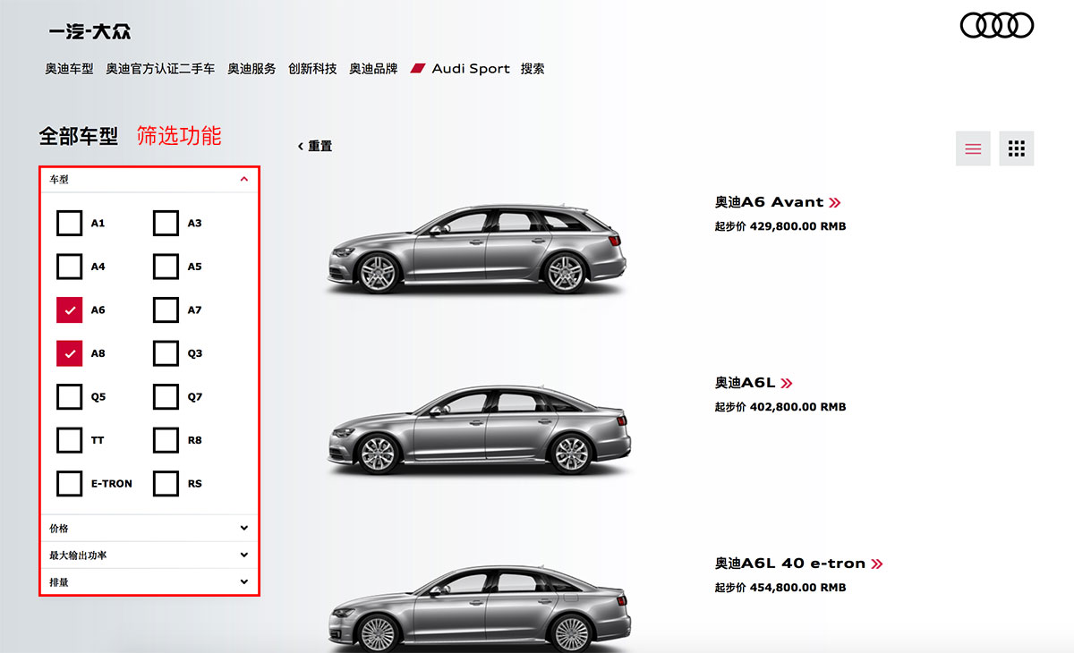產(chǎn)品列表頁的設(shè)計可以根據(jù)跨國公司的產(chǎn)品線來設(shè)計,如果產(chǎn)品線多、產(chǎn)品型號多,就可以設(shè)計成具有篩選功能的產(chǎn)品列表頁。用戶可以根據(jù)不同的品類、型號、價格、功能、參數(shù)去選擇想要的產(chǎn)品。