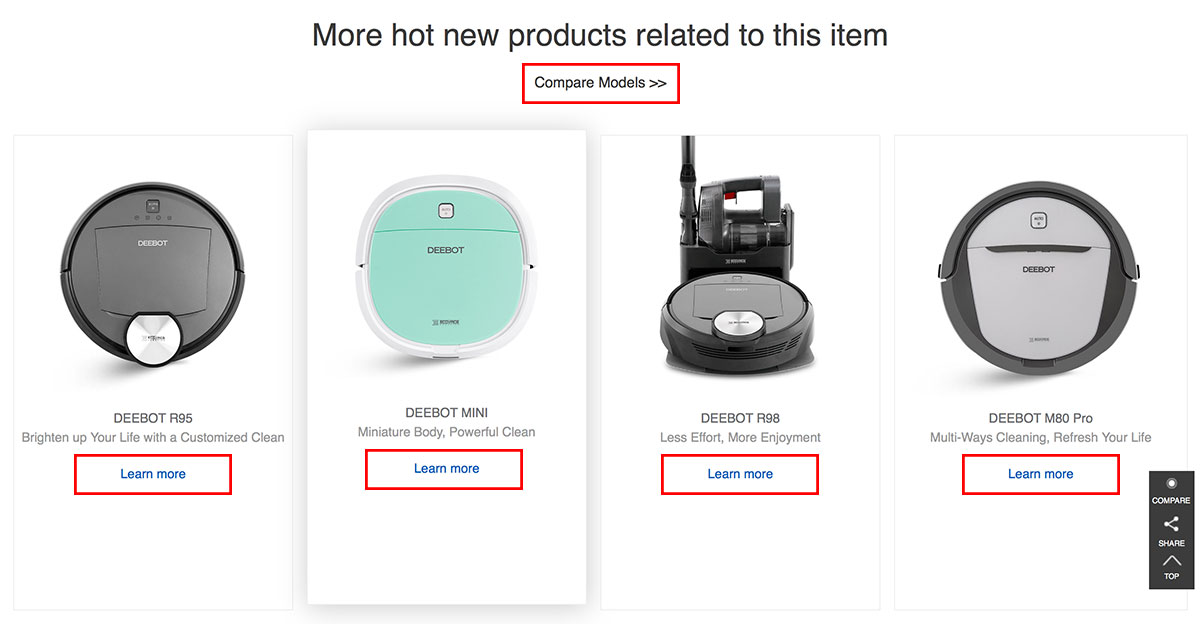 高質(zhì)量的精修產(chǎn)品圖片、產(chǎn)品視頻、抓人的文案、閱讀舒適的排版……這些都提升頁面的轉(zhuǎn)化率的制勝法寶。那么,如果展示的是同一品類的產(chǎn)品,比如掃地機器人,我們應(yīng)該怎樣通過設(shè)計去體現(xiàn)不同型號的價格呢?
