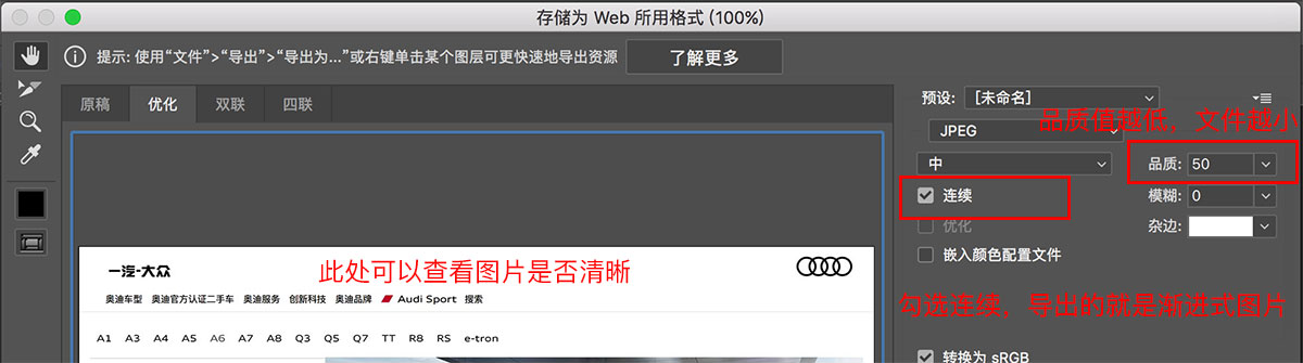 必須對圖片進行壓縮處理,既要文件?。繌垐D片不超過100kb),又要保持清晰,漸進式圖片是最好的選擇。漸進式圖片帶來的好處是——讓用戶還沒有下載完圖片,就可以看到最終圖像的大致輪廓,一定程度上可以提升用戶體驗。