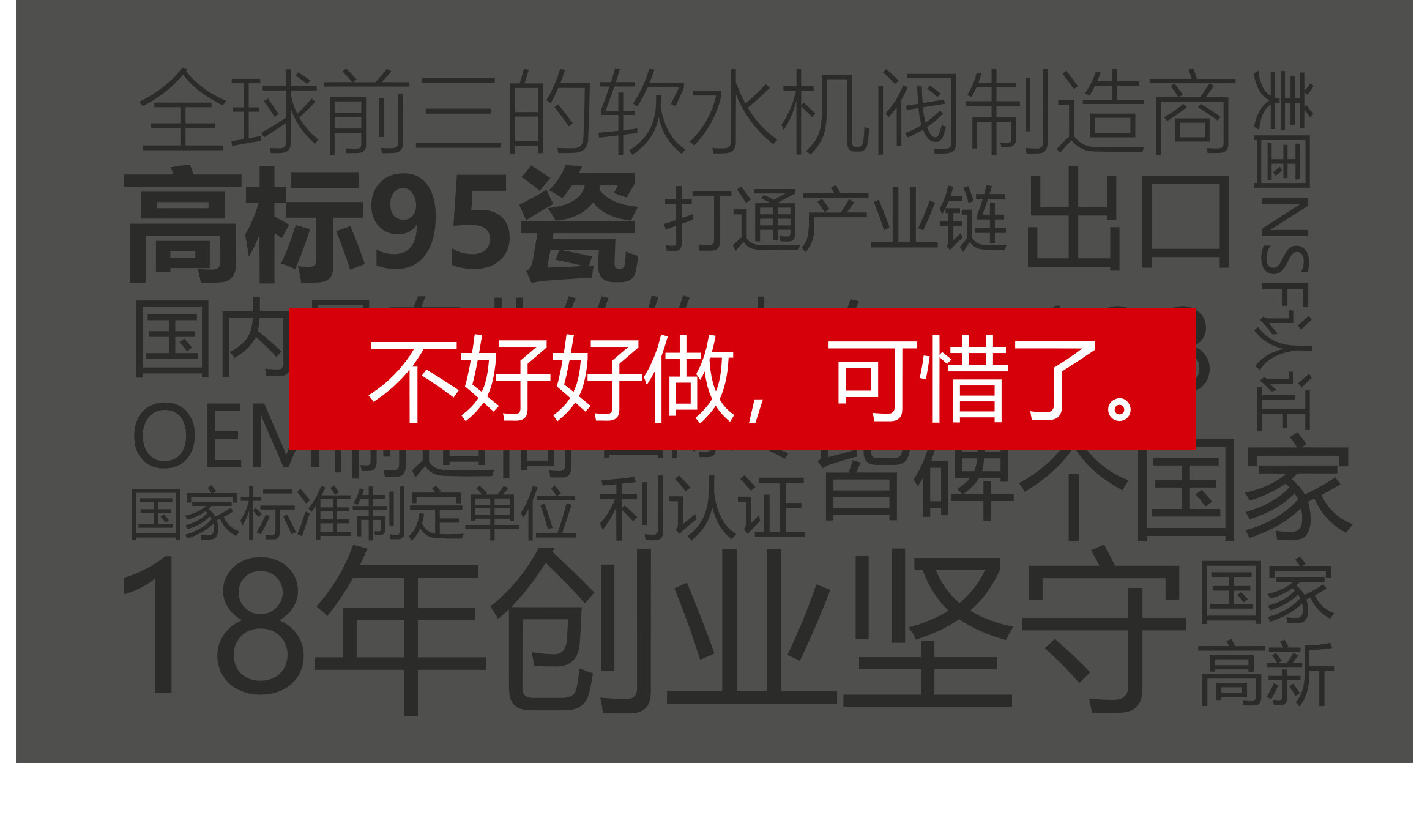理由很顯然,一塊年租金均價(jià)20萬的廣告牌,口號(hào)里出現(xiàn)品牌名會(huì)比不出現(xiàn)效果更突出。于是又是無休止的羅列和思考,光在用還是選這個(gè)字的斟酌上,大概就耗去了兩天,好在我厚臉皮的功力與日見長,私人顧問團(tuán)給出了很棒的建議,我們確定了好軟水用潤萊的口號(hào),不用選的原因則是選相比用態(tài)度有猶豫,同時(shí)選會(huì)造成誤解,而之所以用用,是為了防止消費(fèi)者認(rèn)為軟水是某種包裝水,用則暗示潤萊是一種軟水設(shè)備。(各位仔細(xì)體會(huì))