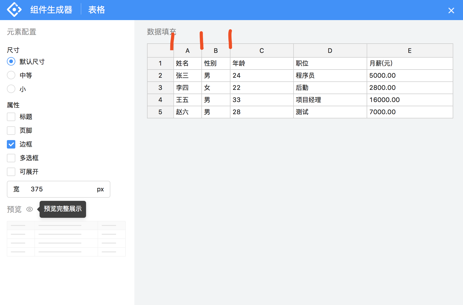 最終生成的表格,邊框,背景,顏色,對(duì)齊方式等等都已經(jīng)定死了樣式,每一列的寬度也不夠靈活,比如 性別這一列,只會(huì)有一個(gè)字,寬度可以適當(dāng)縮小。