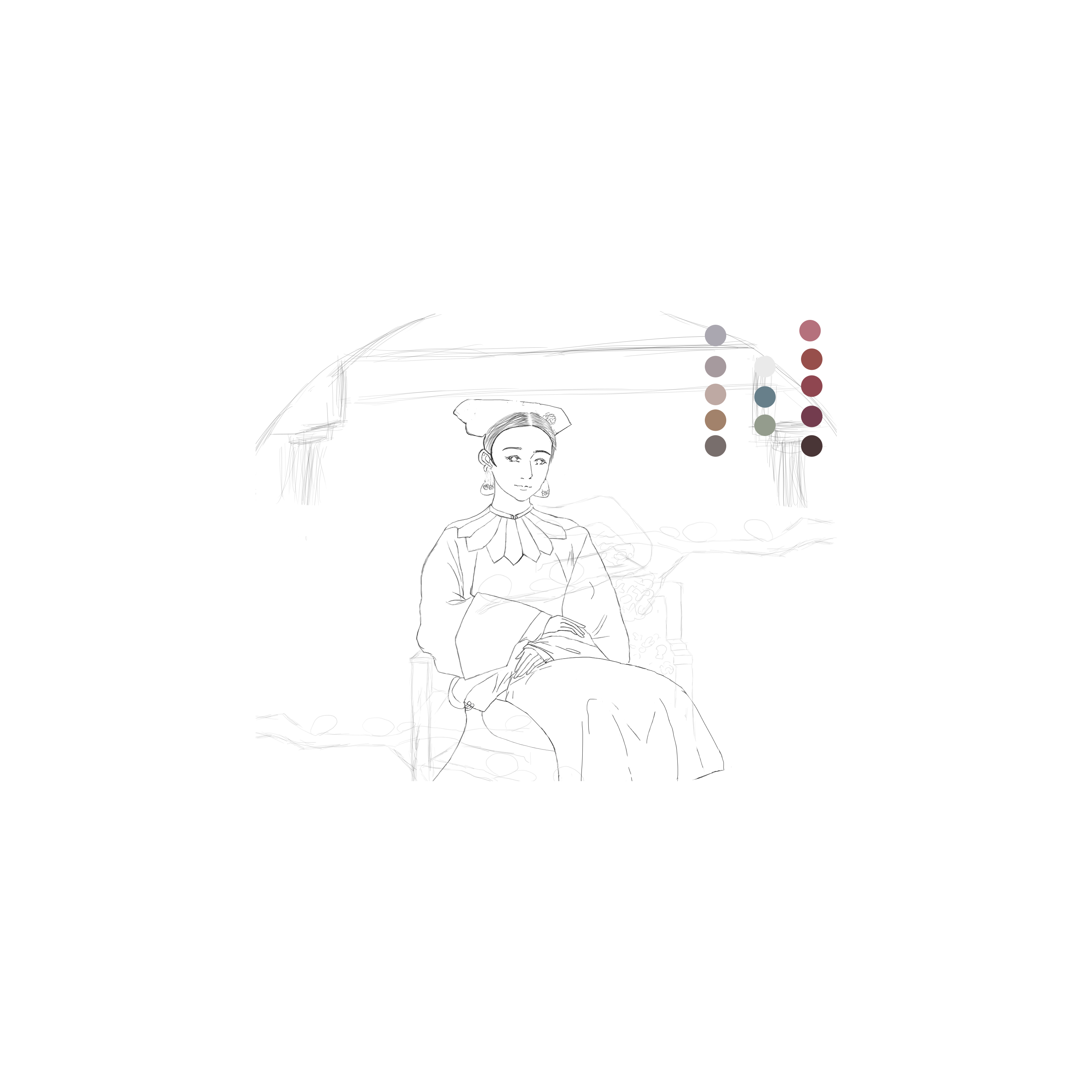第二張是線稿:線稿是要對(duì)之前一張草圖進(jìn)行線條的優(yōu)化,這個(gè)需要多練習(xí)的,讓手部肌肉形成記憶,在畫的時(shí)候盡量讓線條優(yōu)美一點(diǎn).這稿要考慮細(xì)節(jié),比如圖中的發(fā)飾的樣式,還有衣服的褶皺,最好圖的每個(gè)部位都考慮得盡量詳細(xì)一點(diǎn).我在右邊枚舉了幾種顏色,是參考原圖的配色,盡量用上網(wǎng)上流行的莫蘭迪配色,這樣更符合古代,宮廷的風(fēng)格.