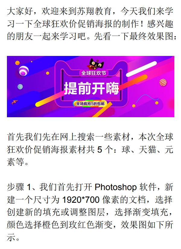 大家好,歡迎來到蘇翔教育,今天我們來學習一下全球狂歡價促銷海報的制作!感興趣的朋友一起來學習吧。