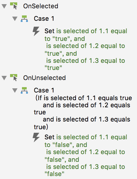 步驟二:為四個(gè)勾選項(xiàng)添加交互前,將四個(gè)勾選項(xiàng)分別命名為1、1.1、1.2、1.3;