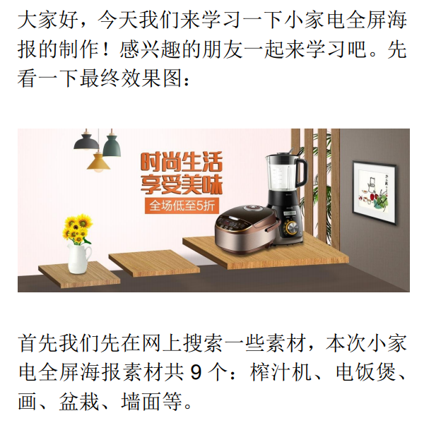 大家好,歡迎來到蘇翔教育,今天我們來學(xué)習(xí)一下小家電全屏海報的制作!感興趣的朋友一起來學(xué)習(xí)吧。