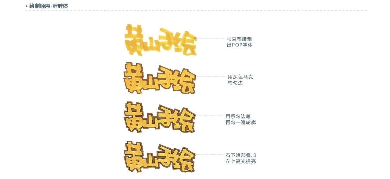 書寫要點:根據(jù)POP字體的骨架,將字體的筆畫加粗,形狀一定要飽滿。有中間出現(xiàn)空隙的地放,我們只要用一條縫來代替空隙就可以了,這一步可以運用鉛筆,起好稿之后用油性勾邊筆勾邊兩次。