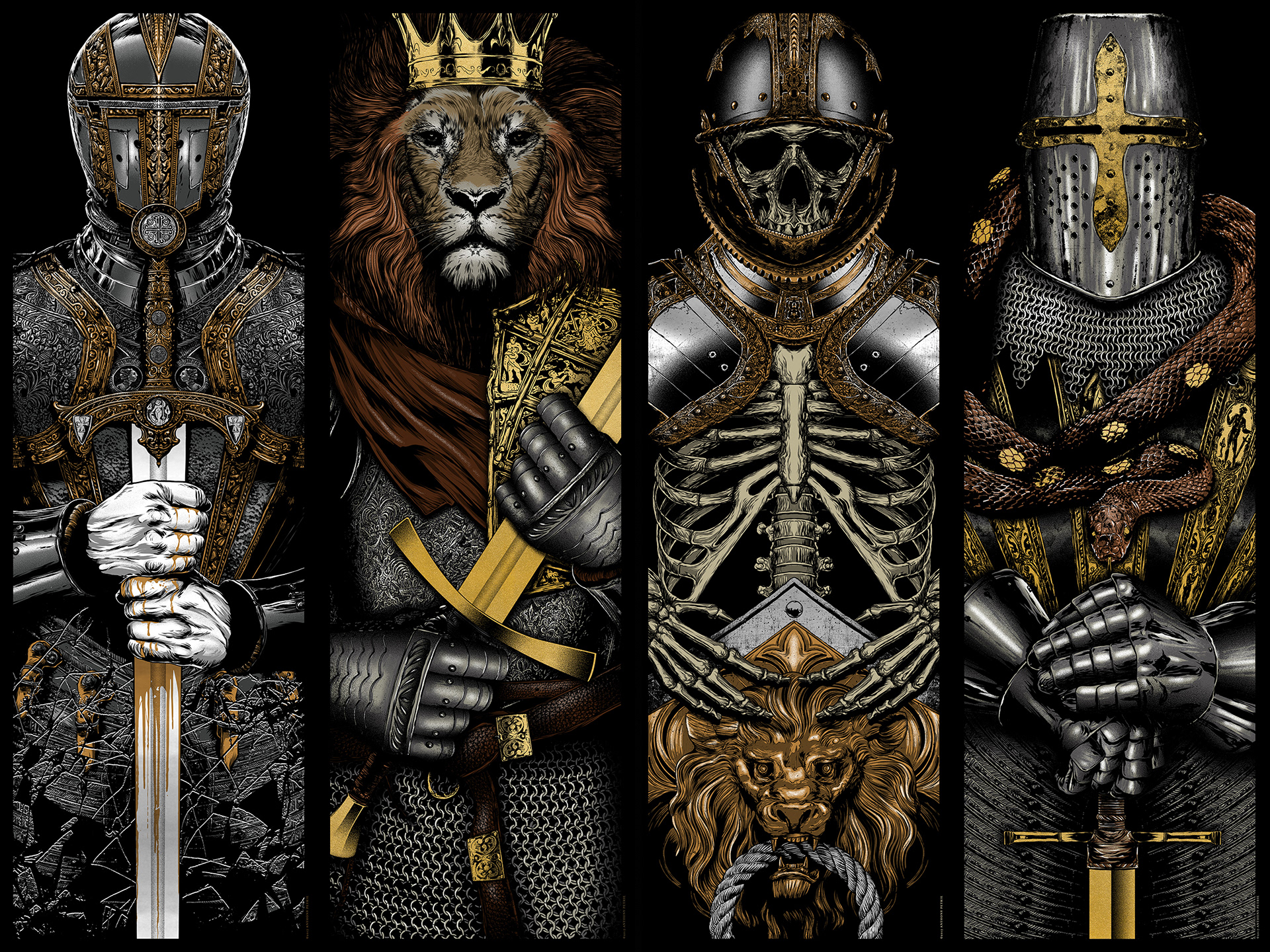 這是一組4張海報,繼續(xù)我的戰(zhàn)士夢想系列的絲網(wǎng)印刷。本卷的靈感來自于“騎士勛章”,其次是中世紀(jì)的北歐騎士。每張海報都巧妙地用金屬箔(鉻和金)絲網(wǎng)印刷,盔甲上有一層透明金屬閃光點。
