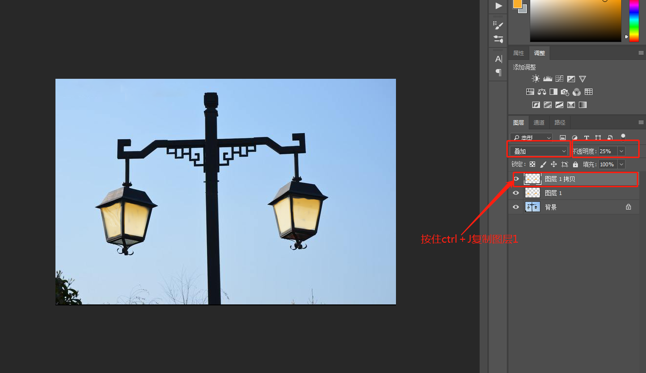 4.   Ctrl+J復(fù)制圖層1,把混合模式改為疊加,不透明調(diào)為25%。