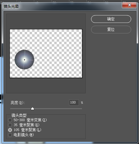 6.   選擇濾鏡—渲染—鏡頭光暈,設(shè)置鏡頭類型為“105毫米聚焦”將光暈的中心點(diǎn)移到中心。