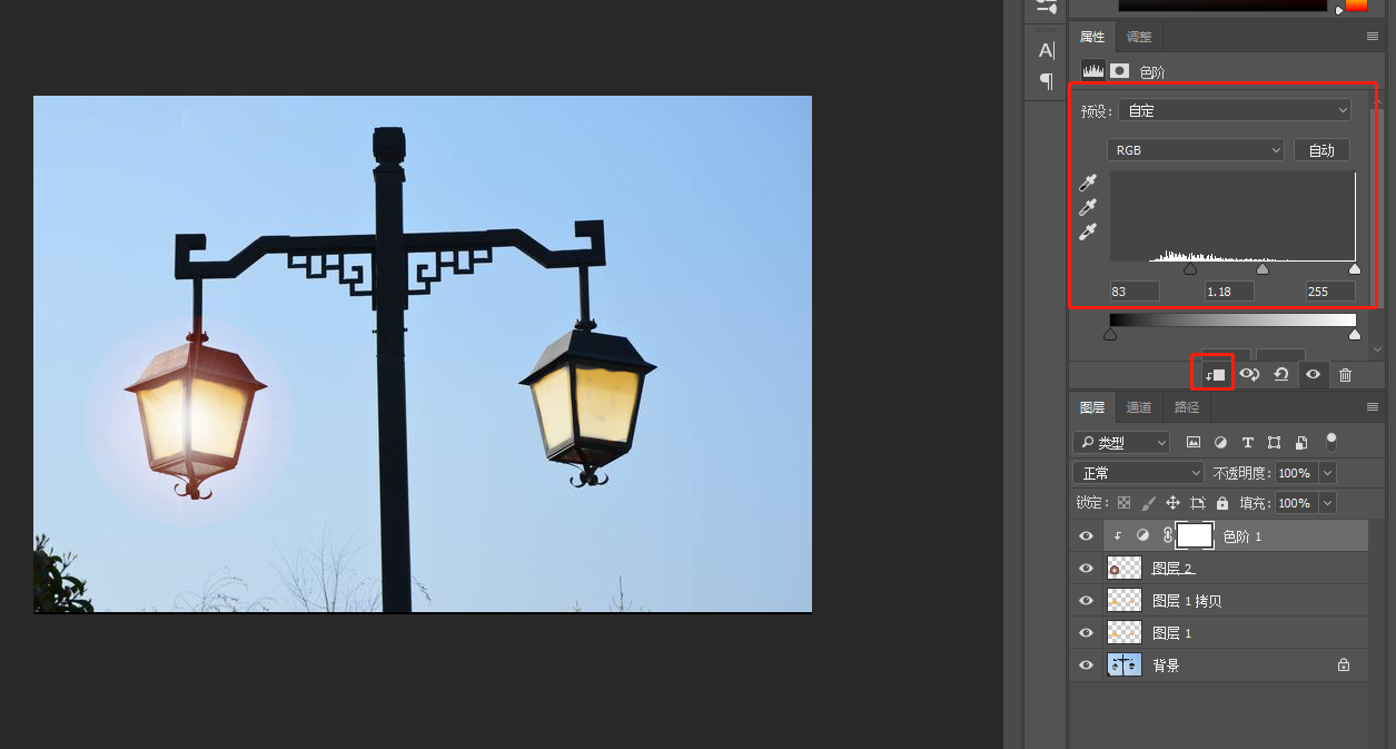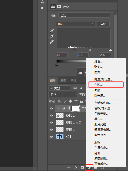 8.在圖層下方找到“創(chuàng)建新的填充或調(diào)整圖層”,打開色階功能,調(diào)整色階的參數(shù)。