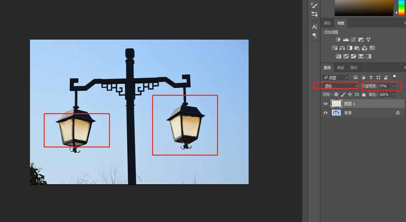 3.   前景色調(diào)為橙色f9ad2a,在剛創(chuàng)建的新圖層上面沿著燈內(nèi)側(cè)涂抹。并且把混合模式改為濾色,不透明調(diào)為77%。