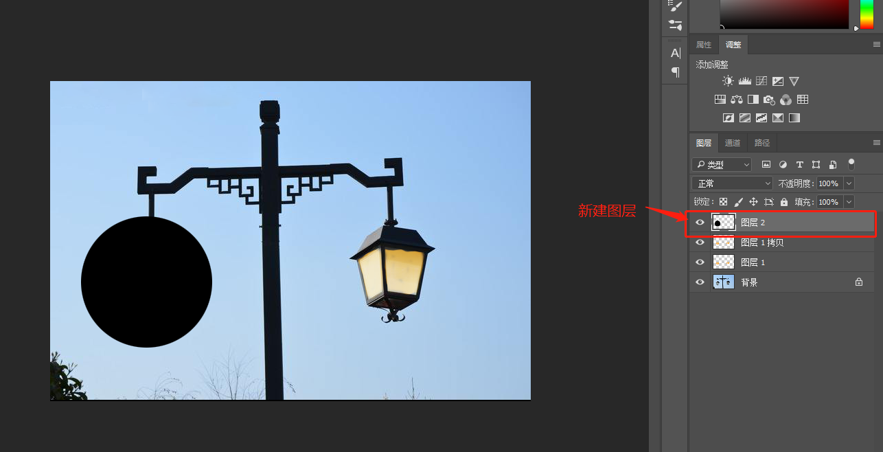 5.   Ctrl+shift+alt+N創(chuàng)建新圖層,使用橢圓選區(qū)工具在路燈上畫圓,按一下D鍵把前景色調(diào)為默認(rèn)黑色,alt+delete填充前景色。
