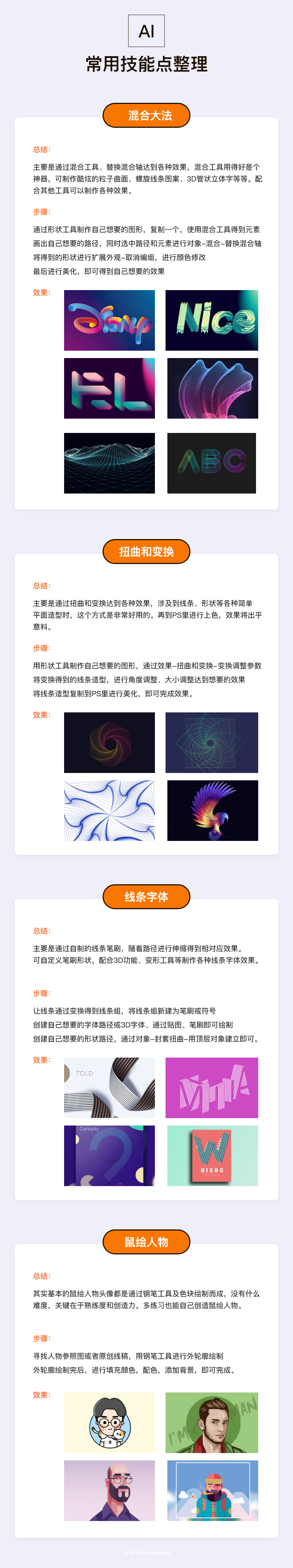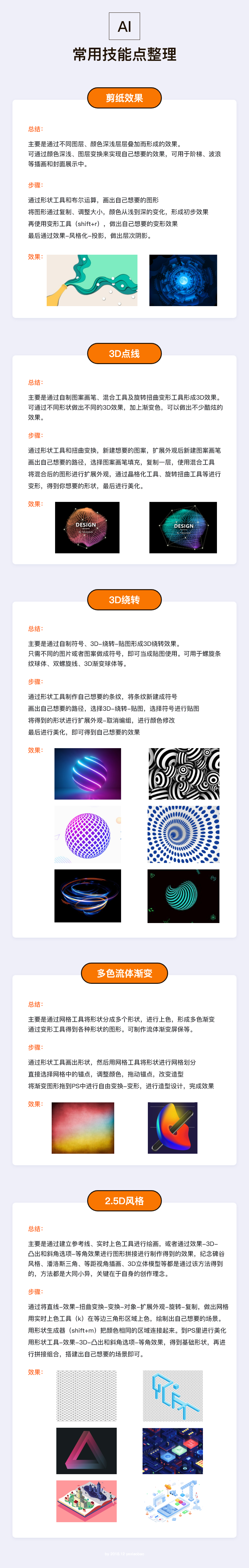 在使用AI軟件的時(shí)候,發(fā)現(xiàn)有很多技能點(diǎn)其實(shí)都是相同的,只要掌握了知識(shí)點(diǎn),其實(shí)都能做出很酷炫的東西,關(guān)鍵在于細(xì)心、耐心和創(chuàng)造。平常由于工作原因并不一定時(shí)常去運(yùn)用這些技能,花了點(diǎn)時(shí)間整理一下日常用的到的技能點(diǎn)是希望自己能在日后需要用到的時(shí)候能夠回憶起并快速上手用到實(shí)踐中,設(shè)計(jì)出更好的作品。