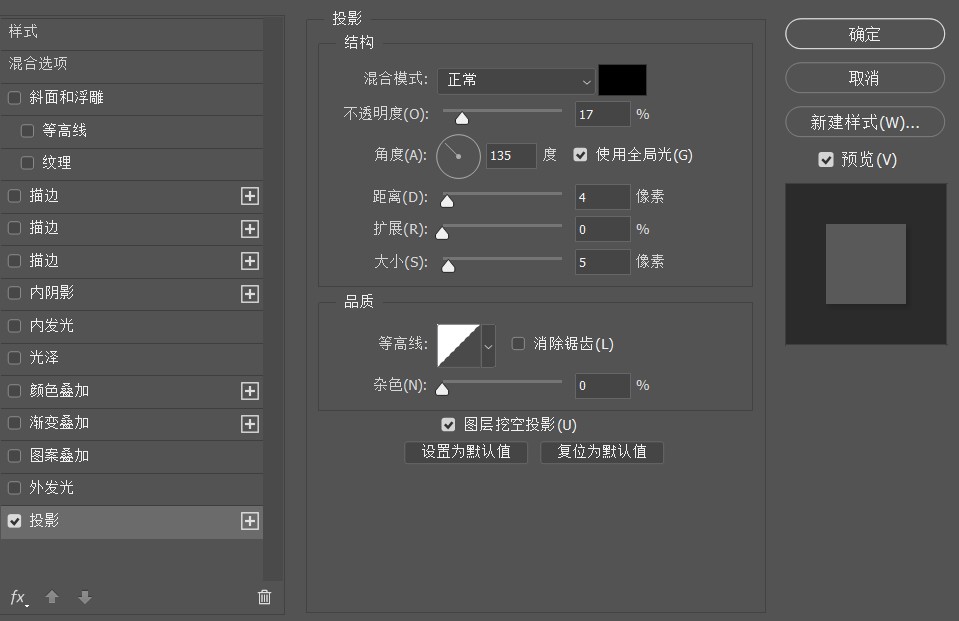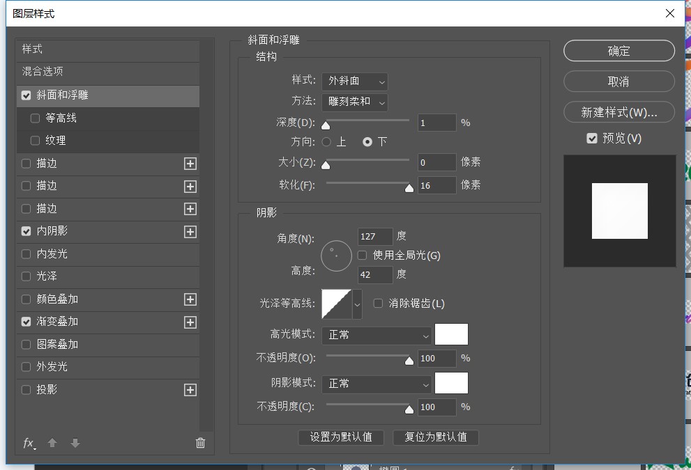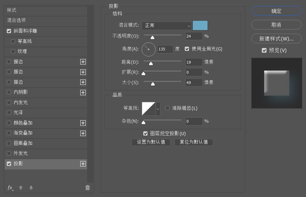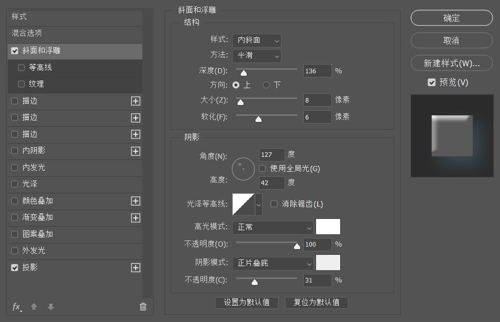 然后調整圖層形狀的斜面浮雕參數和投影參數