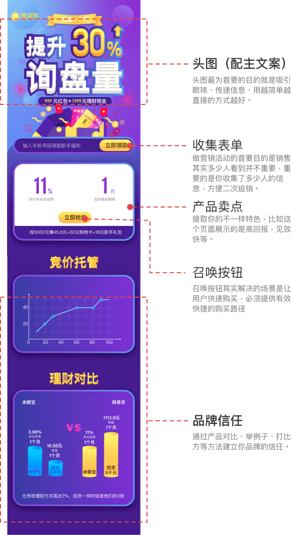 我們拿設(shè)計(jì)著陸頁舉例,著陸頁是指用戶看到廣告后,通過點(diǎn)擊跳轉(zhuǎn)出現(xiàn)的第一個(gè)頁面,且該頁面只有一個(gè)核心頁面。常見的著陸頁組合形式:頭圖(主文案)+產(chǎn)品賣點(diǎn)+收集表單+召喚按鈕+品牌信任