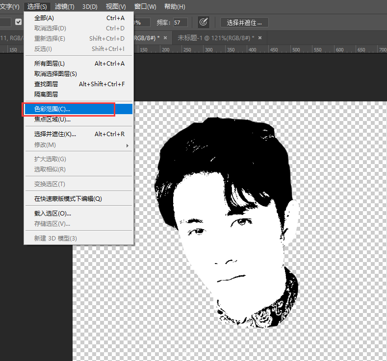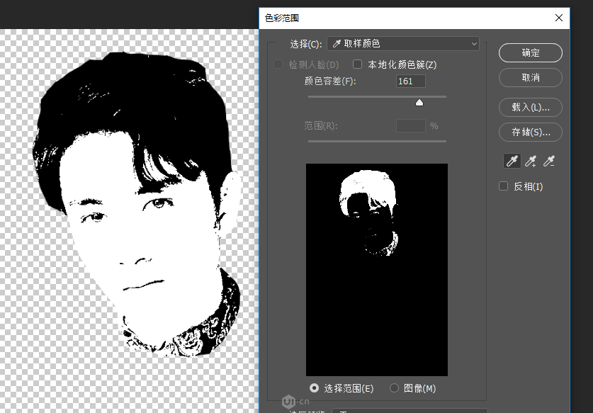 3.現(xiàn)在頭像剪影基本就做好啦,只是我們需要把白色的部分去掉 只留下輪廓,點(diǎn)擊選擇工具-色彩范圍,吸管吸一下黑色部分,選擇一個(gè)合適的數(shù)值,這時(shí)黑色的選區(qū)就出來(lái)了,給他復(fù)制一個(gè)圖層;