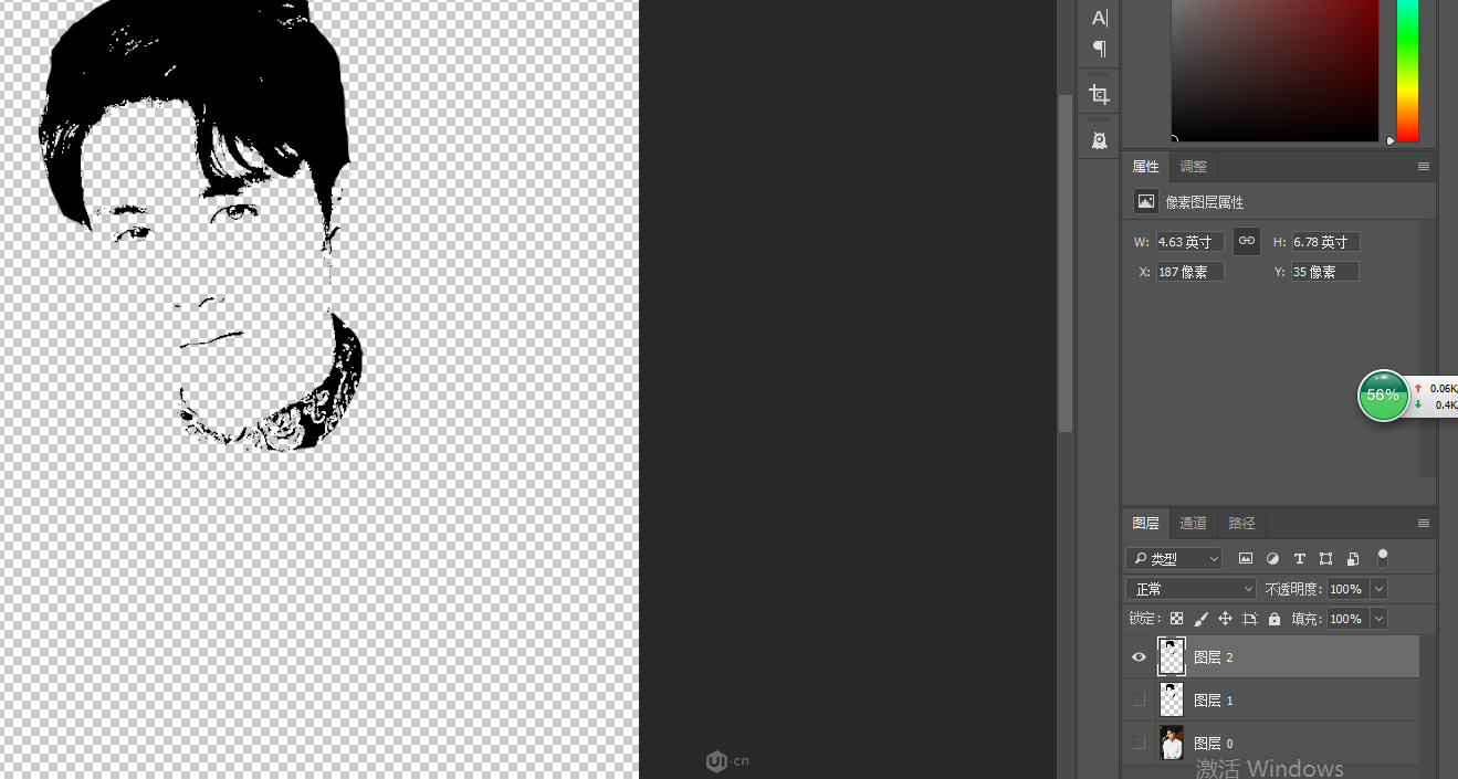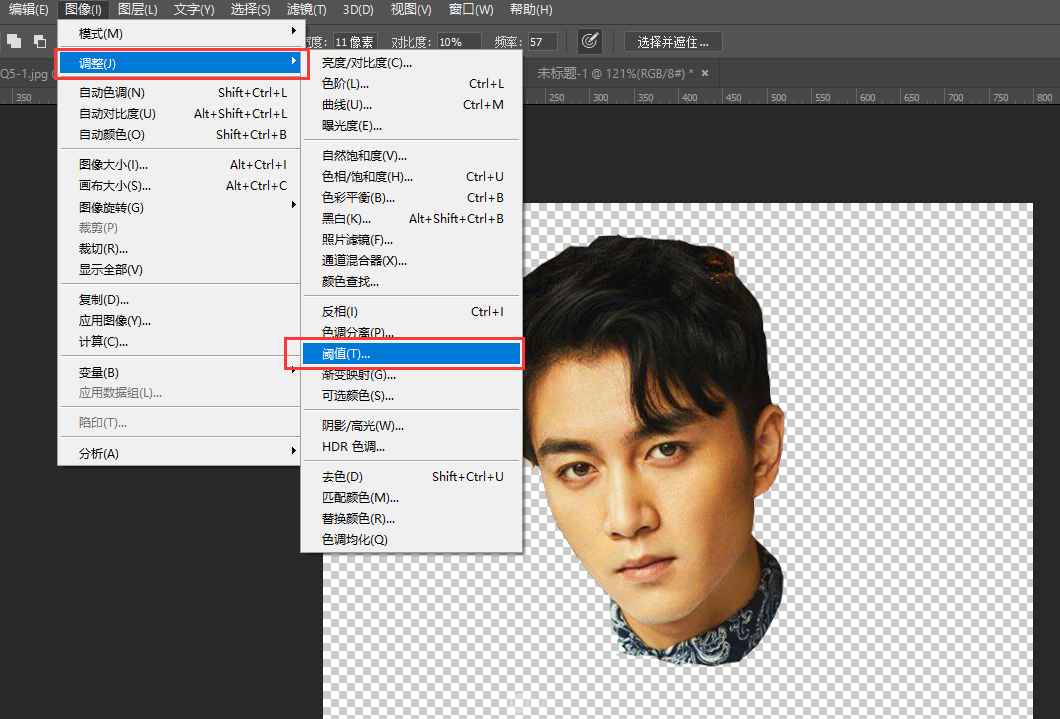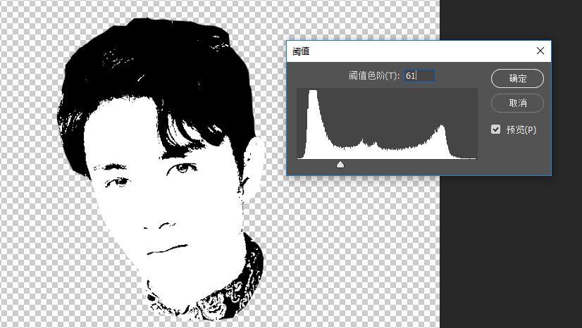 2.把下面圖層的眼睛關(guān)掉,對(duì)頭像圖層進(jìn)行圖像-調(diào)整-闕值,參數(shù)調(diào)節(jié)到你認(rèn)為合適的數(shù)值,ps:最好能看出來(lái)五官和發(fā)絲,不要有太多陰影;