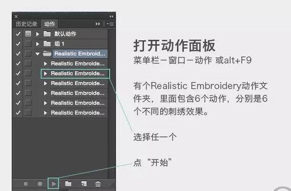 你會看到有個Realistic Embroidery動作文件夾,也就是剛剛的.atn文件加載到了你的ps中。