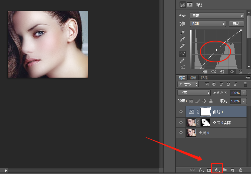 6. 點擊調(diào)整圖層按鈕,選擇曲線命令,為圖層添加曲線調(diào)整圖層,為人像適當進行提亮。