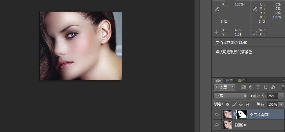 5. 選中畫筆工具將該圖層的不透明度更改為75%,再雀斑處涂抹,面部的雀斑就會去除。