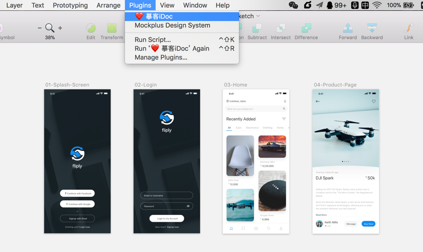 在摹客官網(wǎng)(https://idoc.mockplus.cn/download)下載摹客iDoc Sketch插件安裝文件并點(diǎn)擊進(jìn)行安裝。插件安裝好后打開(kāi)Sketch,在「Plugins插件」中找到摹客 iDoc 插件,選擇并打開(kāi)。