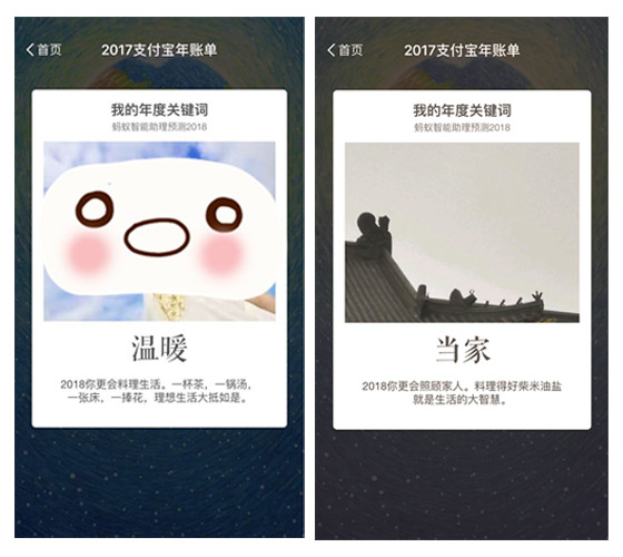 不過回想起去年支付寶年賬單的刷屏,確實讓人印象深刻呢~我們不僅能了解自己一年的消費情況,還能分享到朋友圈,通過支付寶給我們每個人的關鍵詞:溫暖、才華、當家…,借勢刷一下存在感,優(yōu)化一下自己的形象,真是完美~