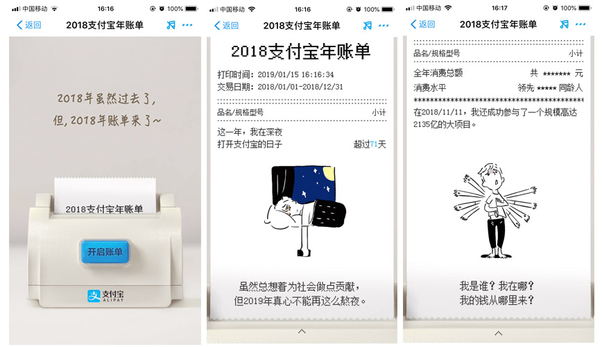 那么問題來了,今年的支付寶賬單為什么沒有大幅度刷屏呢?小編猜想,應該是缺少了對用戶形象的塑造吧,賬單內容只是一年消費的統(tǒng)計、與同齡人的消費對比(小編認為這種對比最起碼降低了80%的用戶的分享欲望)、加上幾句不痛不癢的文案介紹,實在沒有什么分享的欲望,大佬今年的賬單是不是做的有點隨便啦~