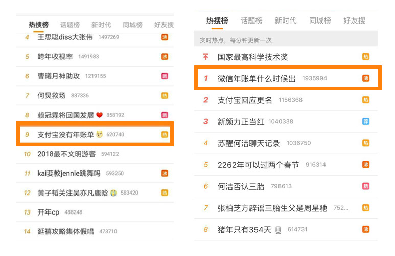 不知道大家有沒有注意,前段時間的某一天,微博熱搜竟然出現(xiàn)這樣一條內容:“支付寶沒有年賬單”,而就在支付寶賬單被大家呼喚出來后,微博熱搜上緊接著又出現(xiàn)了:“微信年賬單什么時候出”。
