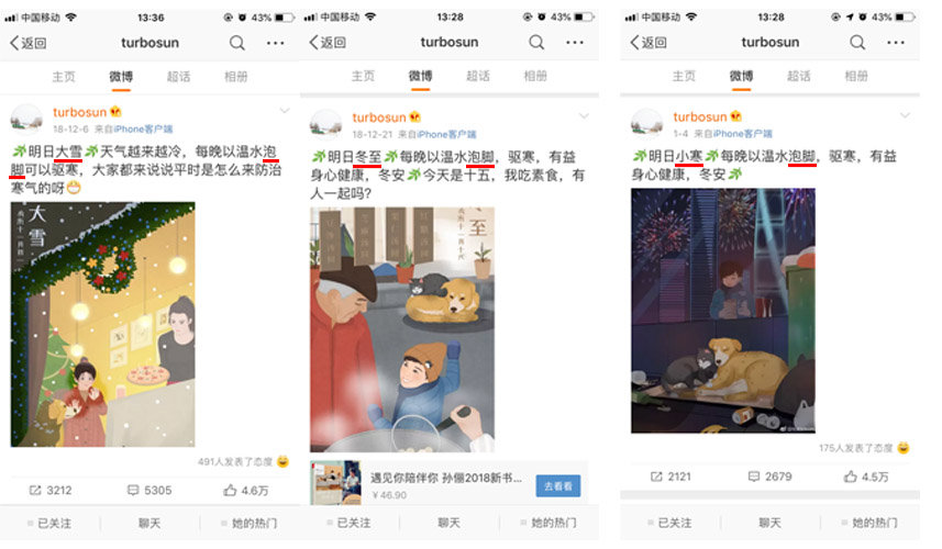 幫助別人這種行為就很好理解啦,指的是用戶看到一些對自己或對他人有用的內容,也會樂于轉發(fā)和分享。比如,微博上總是提醒我們泡腳的孫儷娘娘。