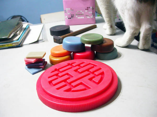 這些彩色的大小磚塊是我們自己調(diào)制的蠟雕作業(yè)用的硬蠟,